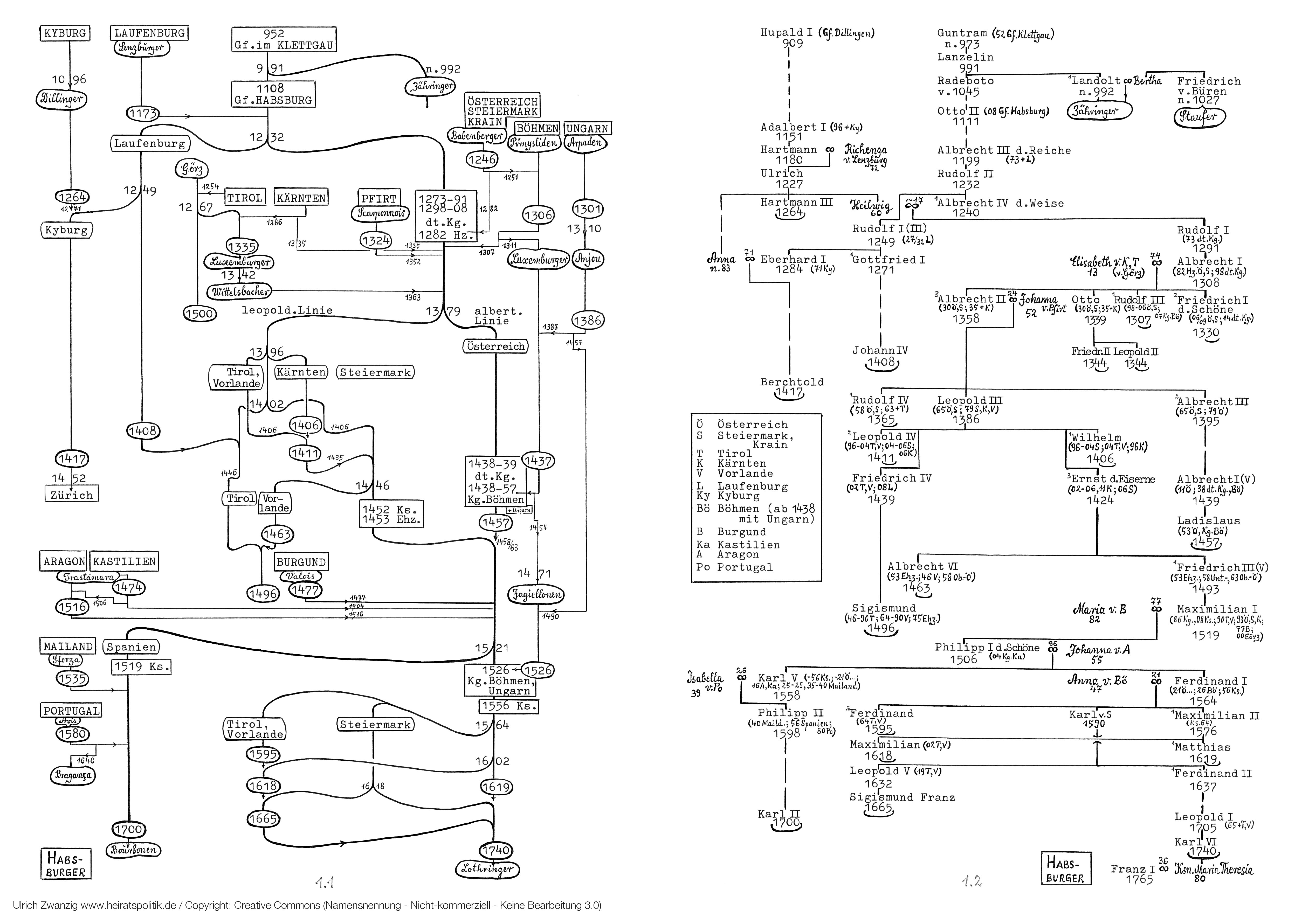Schon vor der Wahl Rudolfs I 1273 zum deutschen König war Habsburg zum wichtigsten Geschlecht am Oberrhein aufgestiegen. Dazu hatte wesentlich beigetragen, daß die Grafen v. Habsburg, wie sie sich nach 1108 nannten, andere schwäbische Geschlechter beerbten: So erhielten sie Laufenburg von den Lenzburgern nach 1172, als Arnold IV, Kyburg von den Dillingern 1264, als Hartmann III gestorben war. Entsprechend wurde 1232 eine Nebenlinie Laufenburg eingerichtet, von der nach 1249 sich wiederum die Nebenlinie Kyburg abspaltete. Als letztere mit Berchtold 1417 endete, fiel Kyburg an Zürich. Das geschah in der Mitte des 15. Jh., als auch die übrigen althabsburgischen Besitzungen in der Schweiz dem Haus endgültig verlorengingen.
