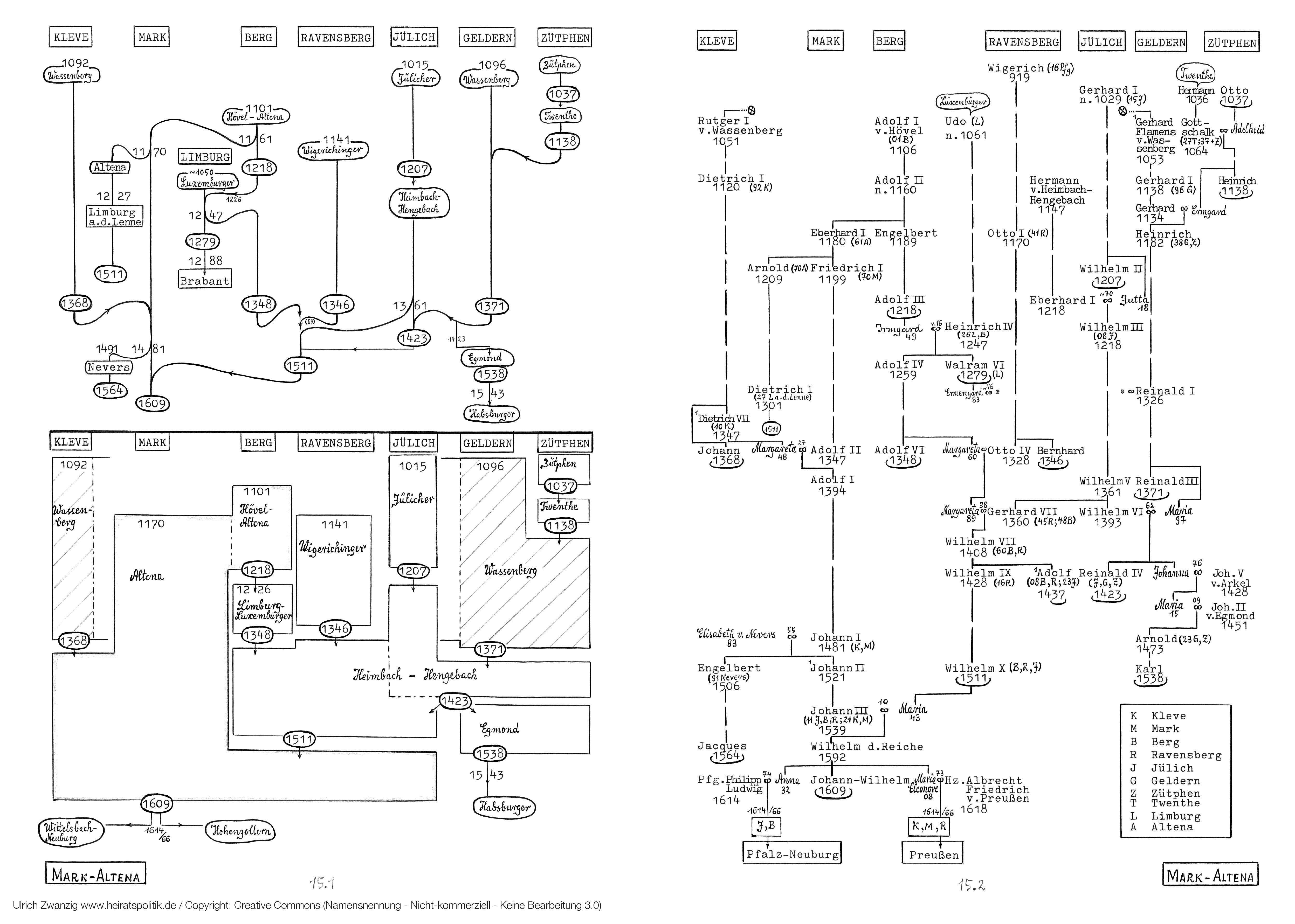Dessen direkter Nachkomme Johann III heiratete Maria, die Erbtochter Wilhelms X, des letzten Heimbach-Hengebach. Damit brachte sie Jülich und Ravensberg sowie erneut Berg in die Familie Altena: Johann III v. Mark und Kleve wurde 1511 auch Inhaber von Jülich, Berg und Ravensberg, so daß also Personalunion bestand (darum keine gestrichelte Linie!), und zwar bis zu Johann-Wilhelms Tod 1609.