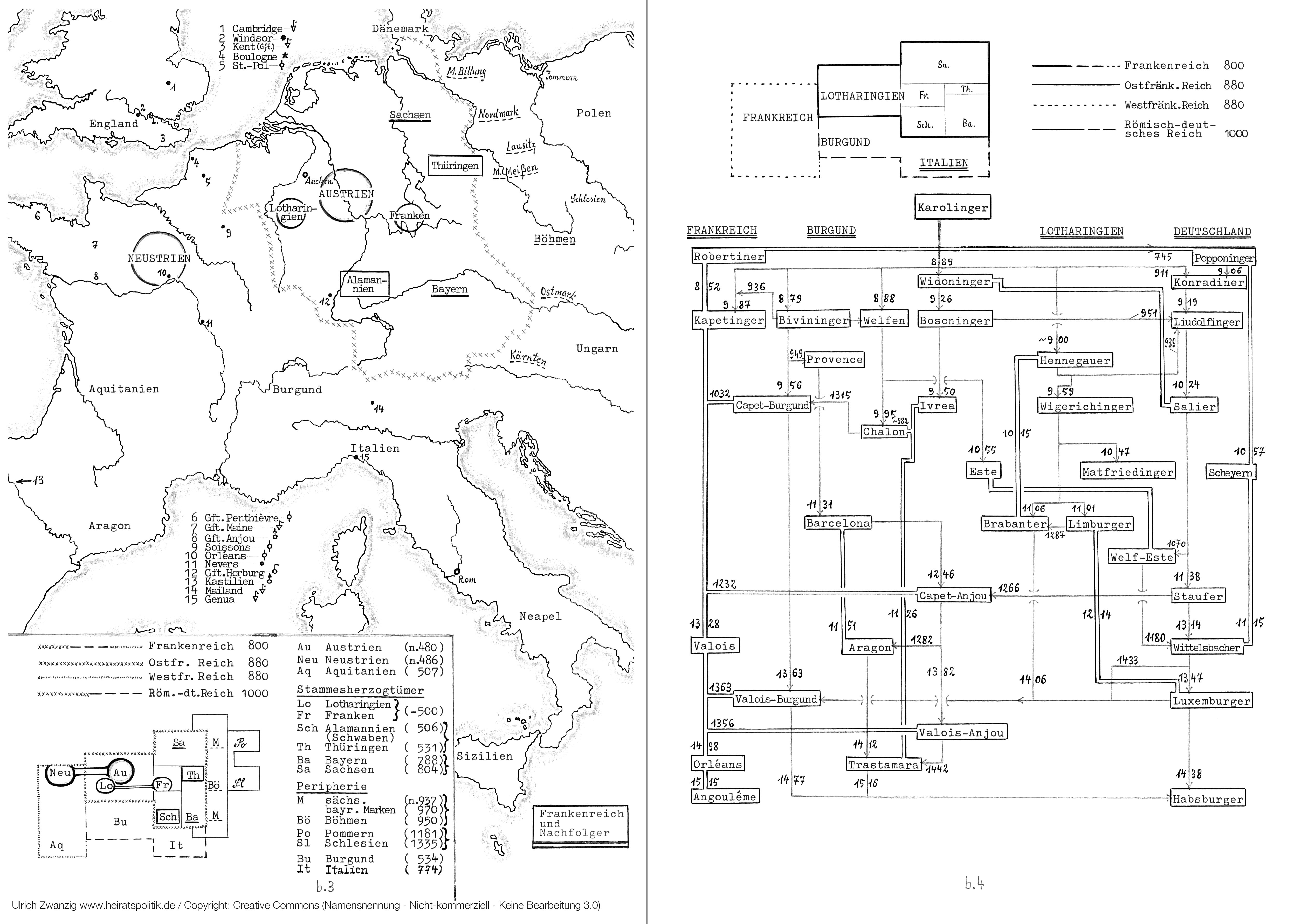 Das Schema b.4, das man als Geschlechter-Stammbaum bezeichnen könnte, illustriert die Entwicklung seit den Karolingern unter dynastischem Gesichtspunkt. In der Mitte sehen wir Dynastien, deren Wirkungsfeld in Italien lag, links Dynastien im französischen, rechts im deutschen Bereich. (Schläuche bezeichnen Zugehörigkeit zur selben Familie, Pfeile bedeuten den Machtwechsel.)