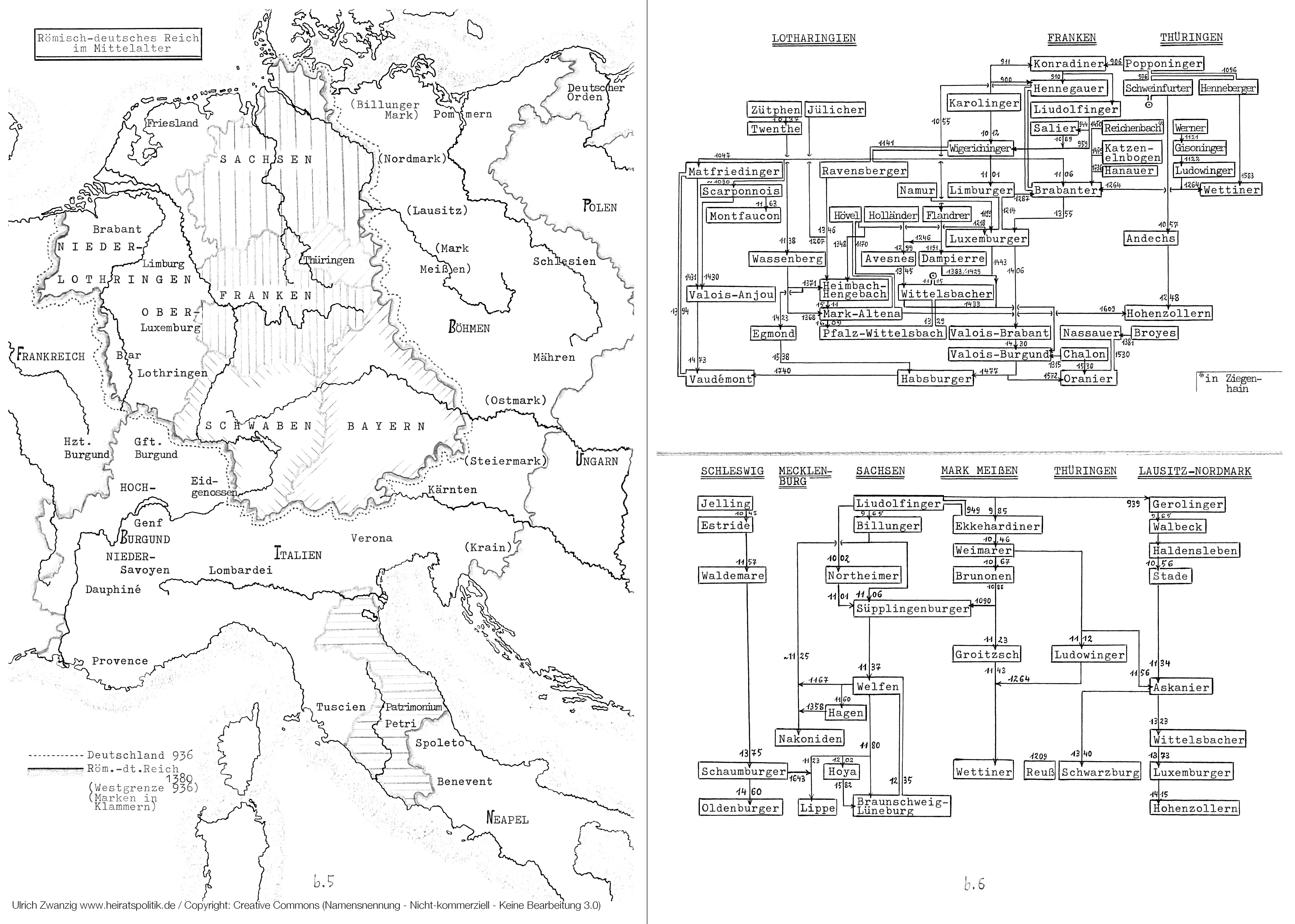 Die Darstellung b.6 bezweckt zweierlei: Erstens faßt sie Angaben zusammen, die in den Kapiteln über die einzelnen 18 Territorialdynastien gemacht worden sind, und zwar: zu den Lothringern, Mark-Altena, Wittelsbachern, Brabantern, Luxemburgern, Wettinern und Nassauern in b.6 oben; zu den Schaumburgern, Oldenburgern, Mecklenburgern, Welfen und Askaniern in b.6 unten.
