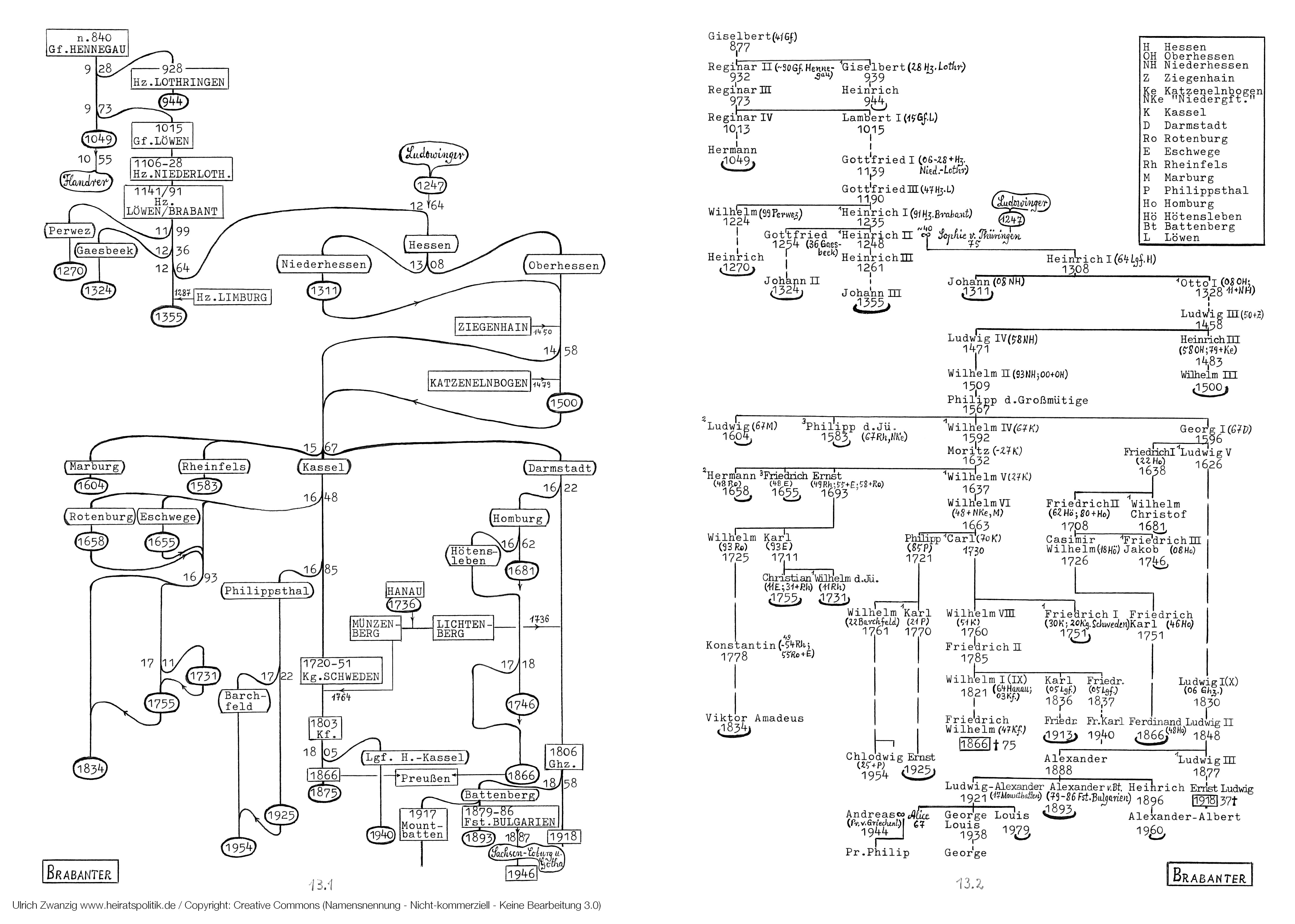 Die hessischen Kurfürsten und Großherzöge gehörten demselben Geschlecht an wie die Herzöge v. Brabant, nämlich den Hennegauern, den Nachkommen Giselberts, des Grafen im Maasgau (ca. 840). In der Familiengeschichte der Brabanter lassen sich mithin drei Phasen unterscheiden: die Phase Hennegau (n. 840-1049), Brabant (1139-1355) und Hessen (1264-1918).
